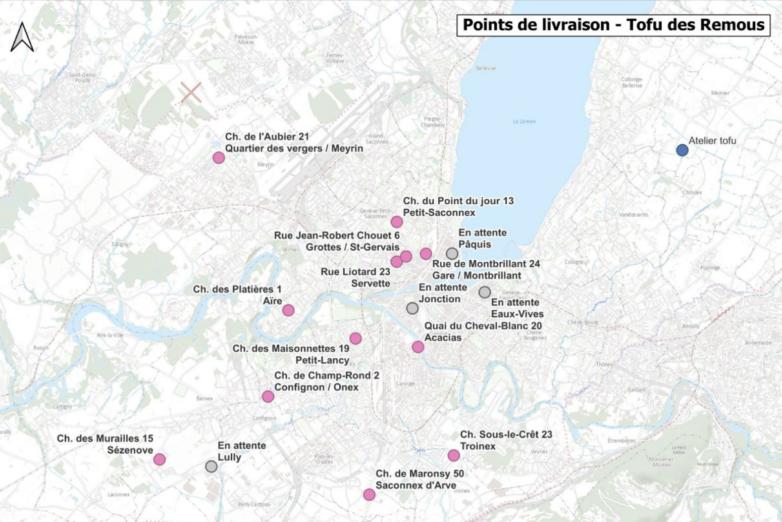 Le tofu est produit tous les lundis, puis distribué à vélo aux points de livraisons (carte ci-dessous). Les tofus sont déposés dans des glacières, avec des éléments de refroidissement, et sont à venir chercher les mardi dès 16h.