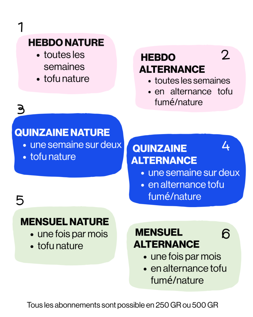 Il est possible de s’inscrire pour un abonnement afin de reçevoir une livraison de tofu régulière.